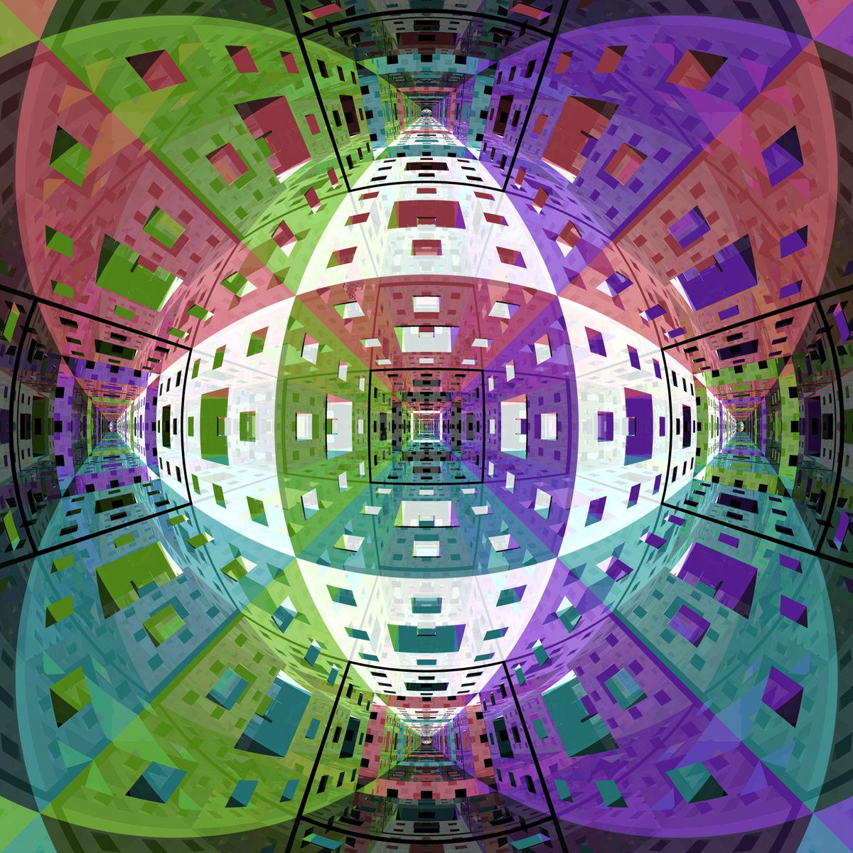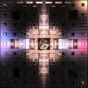Another view of a Menger Sponge made in Structure Synth. In the world centre lit by the Rainbow HDRI from inside and also the camera is in the world centre with the EWL fixed on it so there is a FOV of 222 degrees. Around the Menger Sponge is a fully reflecting cube and all rendered with max Ray Depth set to 12.