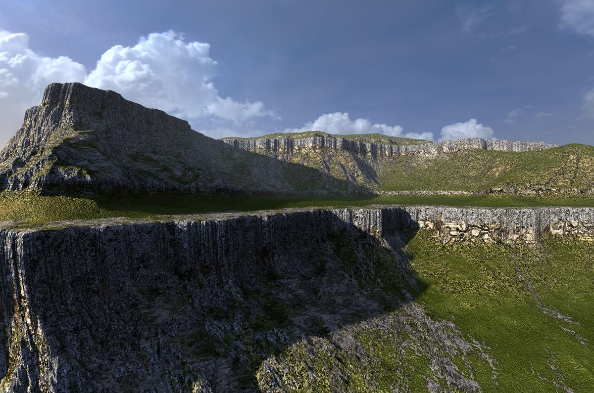 Another landscape with a triple stacked terrain. Lit by the HDRI, a wee bit of sun to brighten the slope at right.