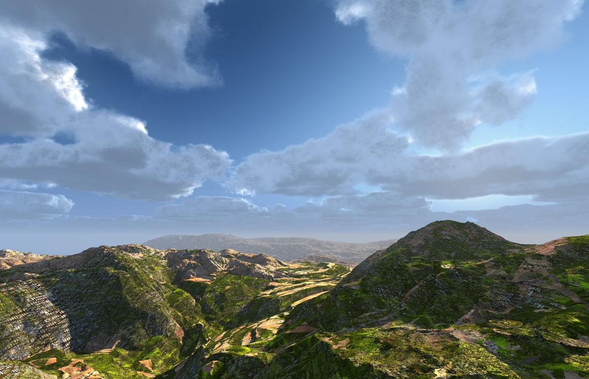 A triple stacked terrain, the sky a sphere with a separately rendered cloud slab as spherical panorama, the ambient light from a specular convolved HDRI made from the panorama and the key light by the sun.