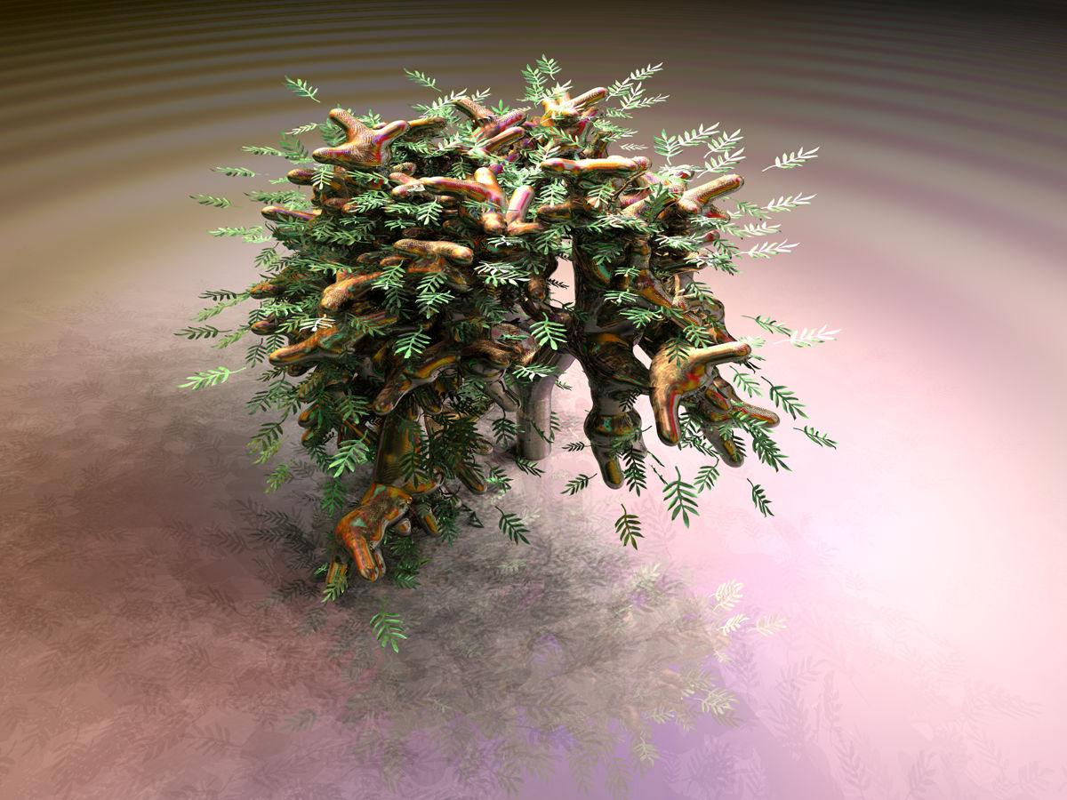 A fun render using a Bryce tree inspired by the "Cairns made from a Bryce Tree" TreeStones.pdf, added leaves and lit exclusively by an HDRI with Quality 128.