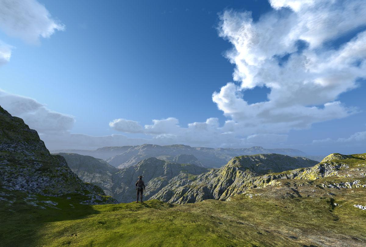 Another landscape, just a terrain with a material that came with Bryce 7.1 Pro (Derbyshire Hills by Contributing Artist David Brinnen) and an old Michael 3. The sky is a sphere with a big spherical panorama rendered from a sky with a volumetric slab; the ambient light comes from a specuar convolved HDRI I made from rendering that slab as panorama.