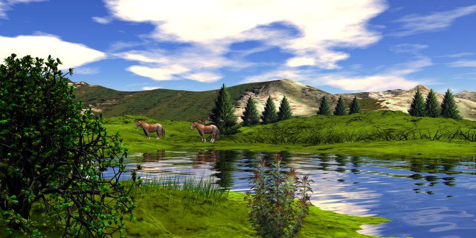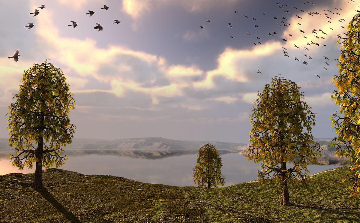 Horo: As we are used too, but still have not seen enough: wonderful landscape. I do wish you would use other elements than only terrains more often. They (like the trees and birds in this one) give live to the scene. The sky is spectacular and the lighting very well done.