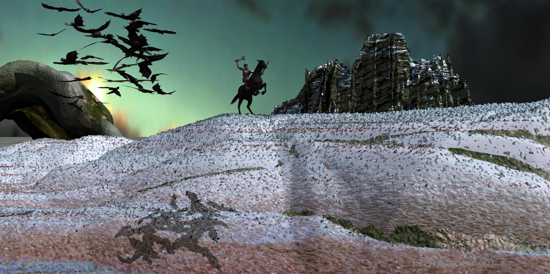 Second started as a simple triple terrain, then I added the Big Cave and another terrain, as well as a the bats from DNA_scatter and the Lumberjack on a horse as well. Light from the sun, and a HDRI (dark sunset).