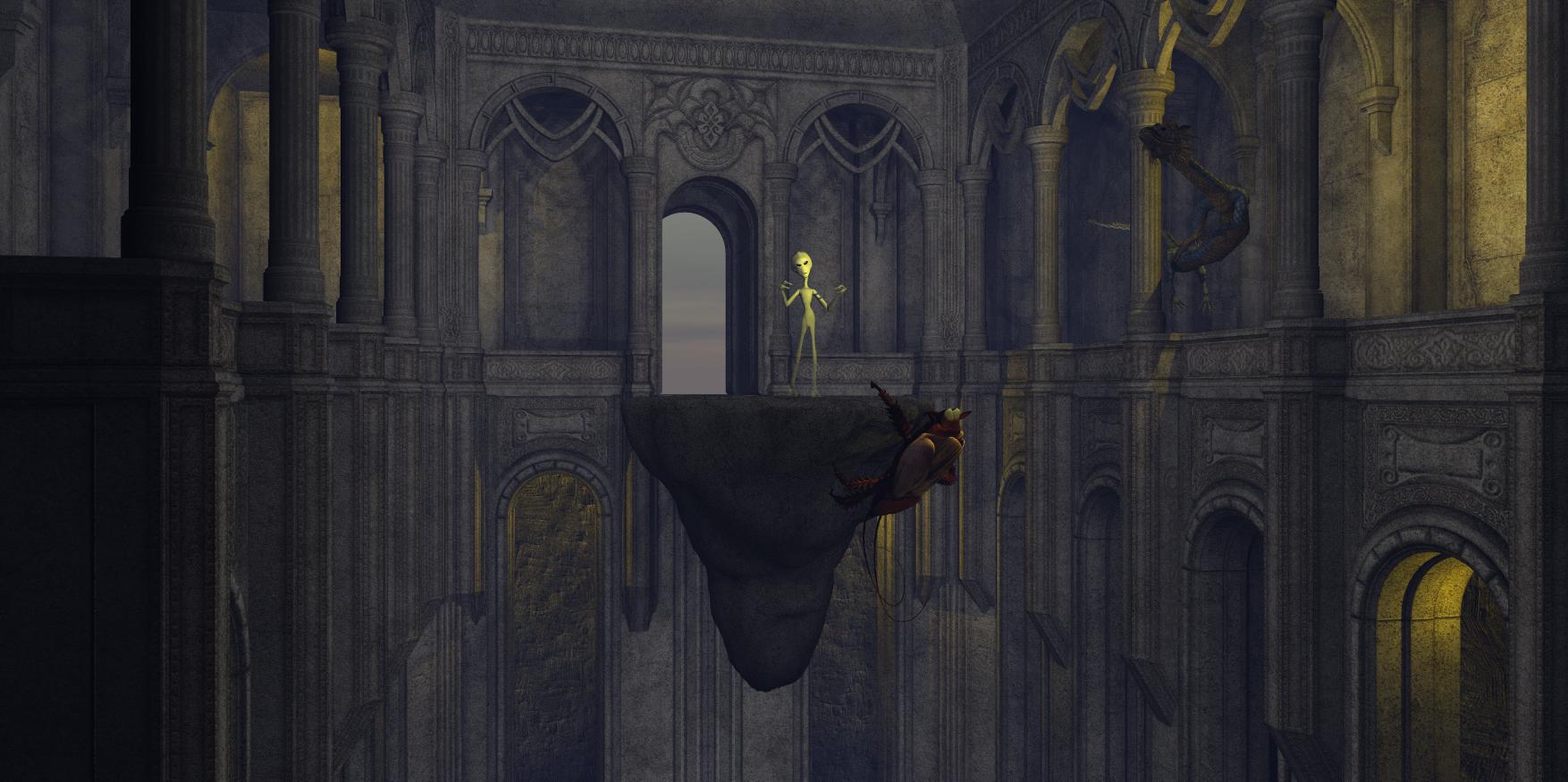 Here's a new one: "Creatures in the hall". The hall is The Alchemy Chasm (here at DAZ). We see RDNA Greyling with the Ghostly Alien texture, the cockroach from Poser and the Eastern Dragon from DAZ. The hall is intentionally dark, but I added some lights in recesses and spotlights on Greyling and cockroach. Hope you like it.