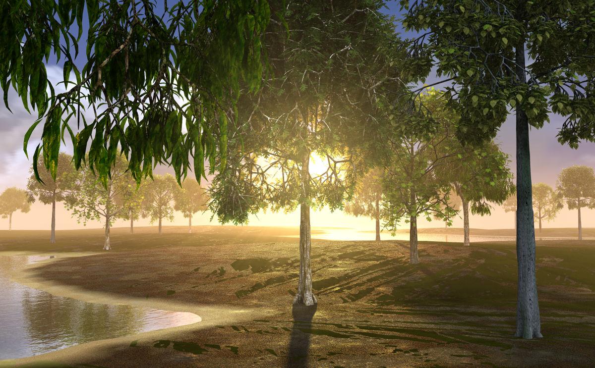 A flat watery region with a couple of instanced BTO trees.