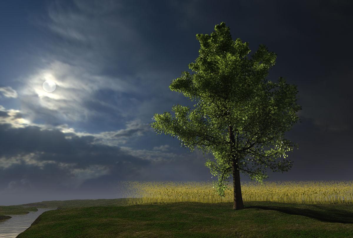 Simple terrain with a simple material, a cube with volume material for the grainfield and an Arbaro tree. Lit by the sun, an HDRI and a distant light.
