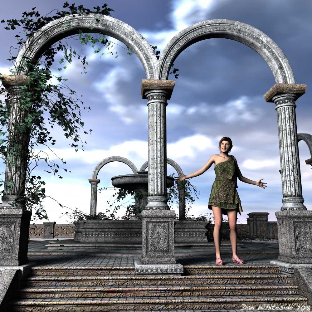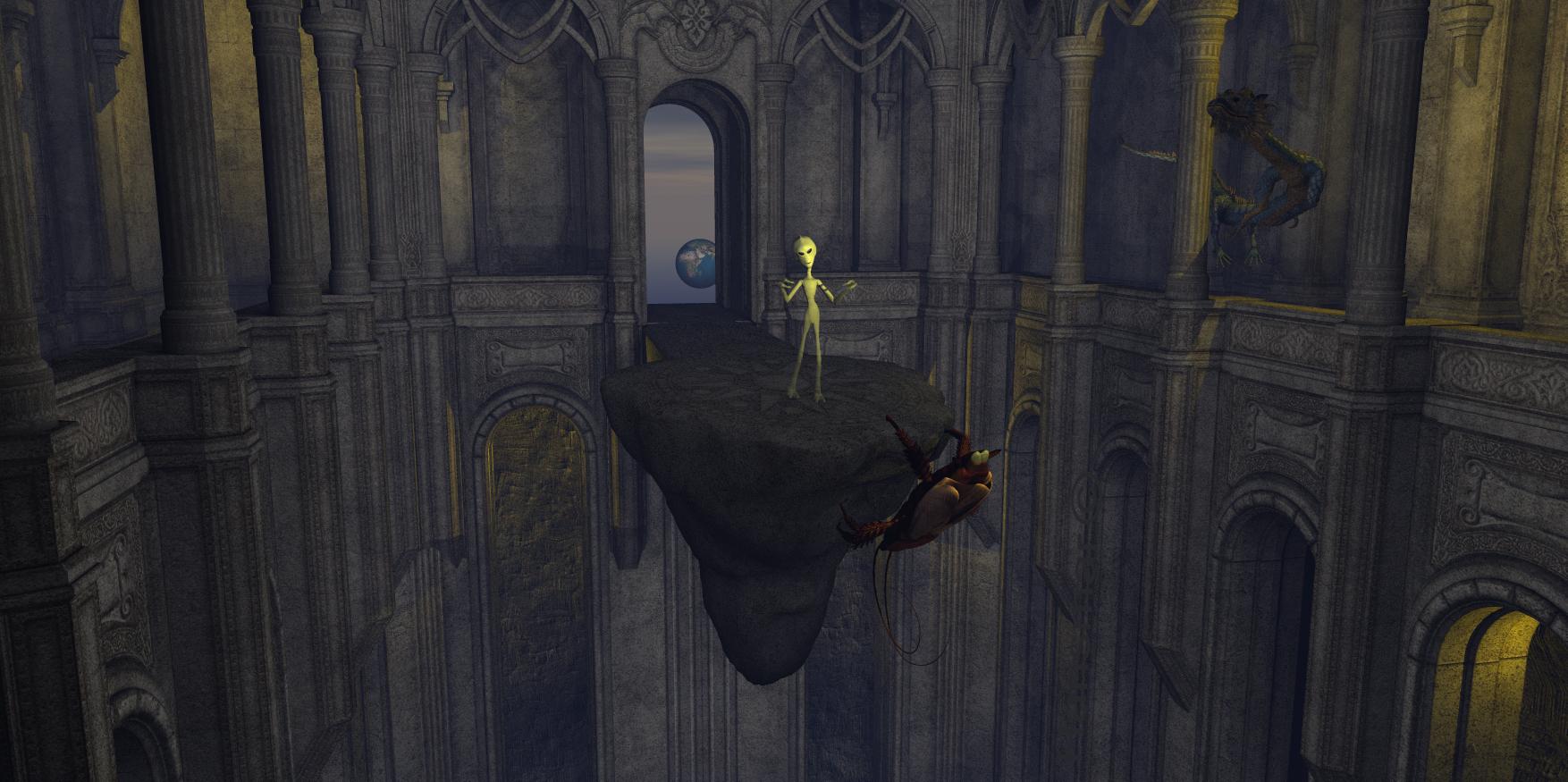 This image drove me nuts! Something about the temple model caused Bryce to crash with great regularity (and only 1.6 GB of RAM used). When I got a render to completly finish I finally gave up…