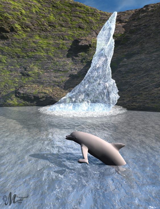 mermaid - nice waterfall, I miss a bit of haze around ot when looking so close. Perhaps one or two elongated spheres with some haze or fog material. The dolphin is cool.