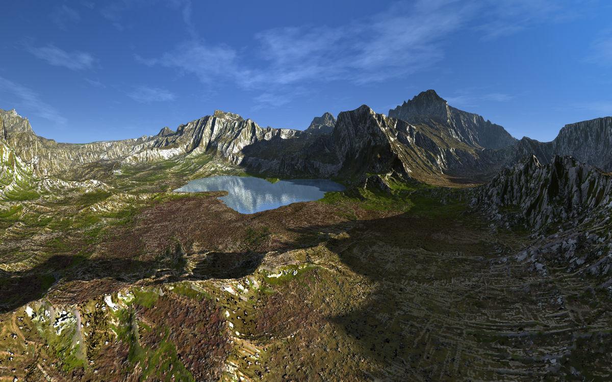 Another mountainous landscape with a small lake. Horizontal angle of view is 170 degrees with the extreme wide-angle fisheye lens (EWL) in front of the camera.