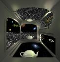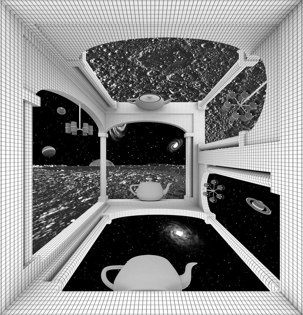 Inspired by M. C. Escher's Andere Wereld (Other Worlds). The building is made of (booleaned) cubes and cylinders. The terrains were made from Moon hight data. The colours from all objects were desaturated. Rendered with the Obscure Gel Light method. Small errors because no object was slanted.