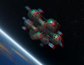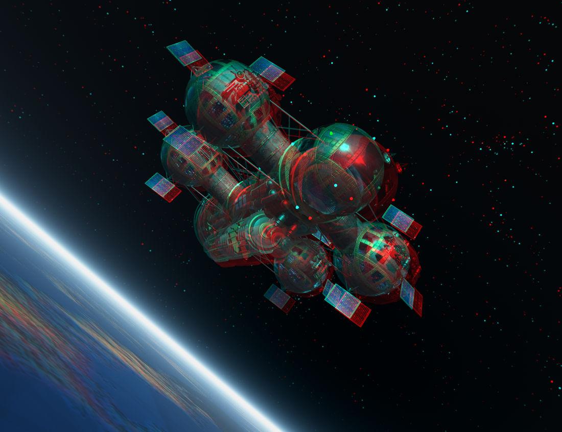 Here is a holographic anaglypgh. It shows that banking (Z) the camera is not a good idea for anaglyphs. We have the eyes horizontal side-by-side. You have to align the line of your eyes with the horizon. The model is LORS-1 (Low Orbit Research Station 1) made fully in Bryce by Alan Armstrong. I had tested this beta version in January 2010.