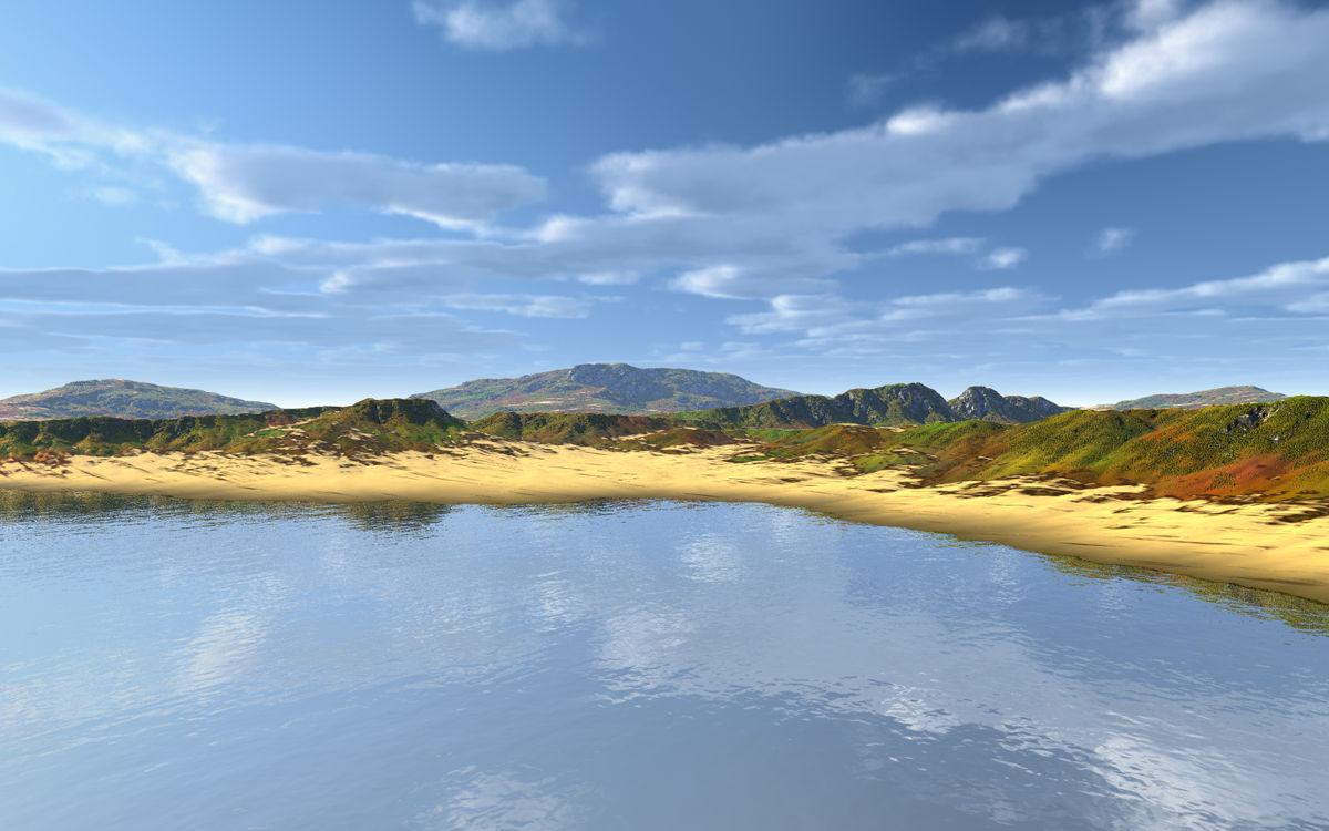 Two simple terrains (X- and W-Isle) with a material I cobbled together. The volume clouds were rendered as spherical panorama and put on a sphere and the ambient light from a specular convolved HDRI made from the cloud panorama. Renders in 7 minutes (though the panorama from the volumetric clouds took many hours to render).