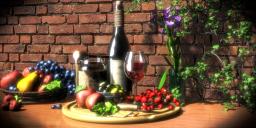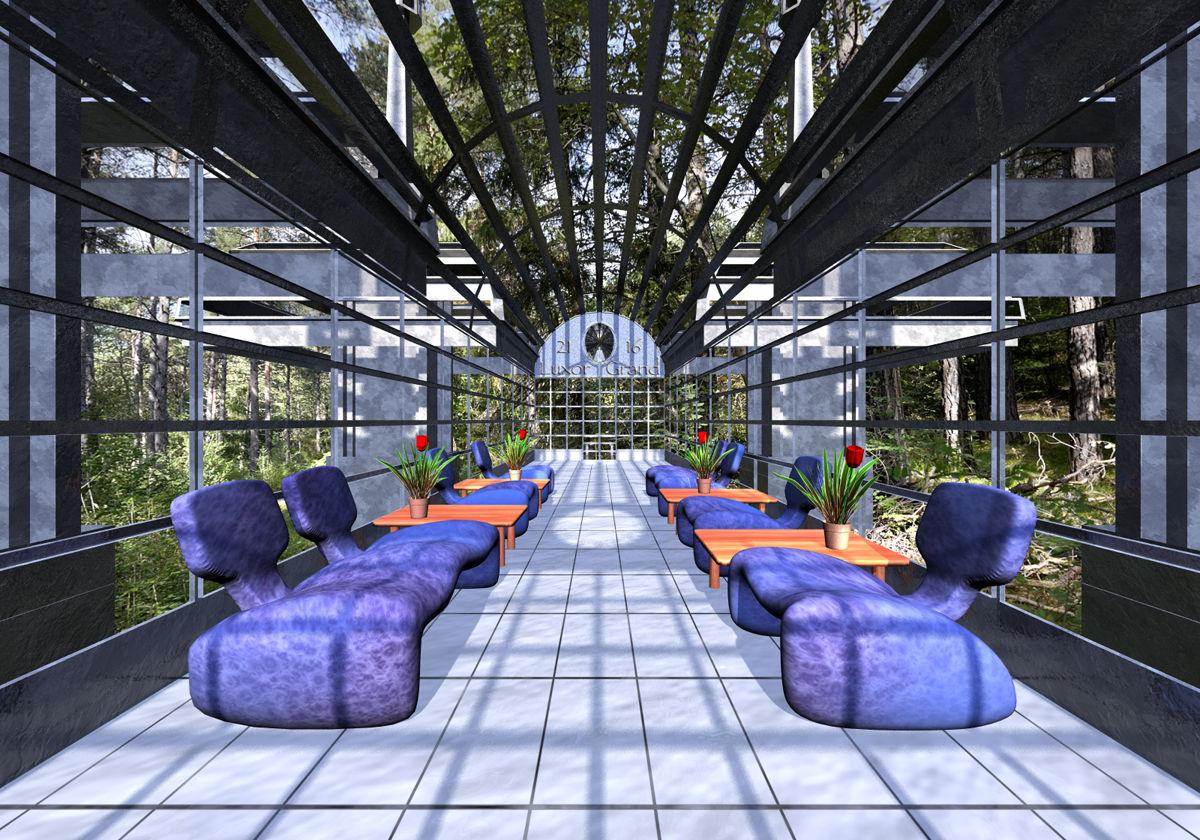 The building is a small part of Dan Whiteside's Tech Building, seats and plants are from the Internet, tables and floor are self made. The forest environment is the tone-mapped Green Path HDRI as LDRI panorama on a sphere, the GreenPath_SC HDRI lights the environment and the sun provides the key light.