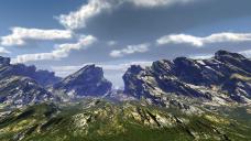Five identical terrains, four of them differently warped and all given an almost identical material. Volumetric clouds pre-rendered as HDRI.