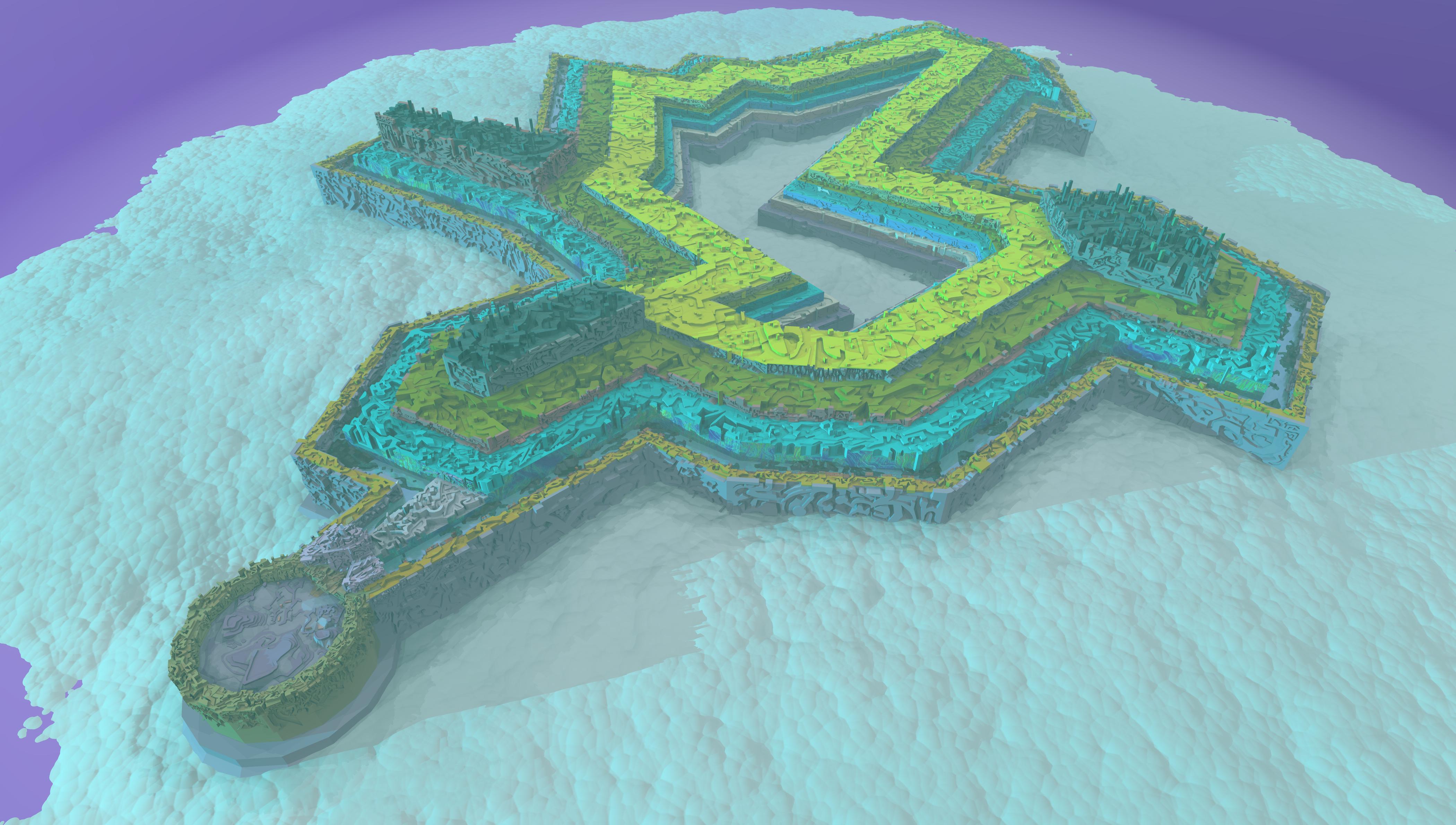 No fancy lighting tricks of wonderful landscapes by me, this time, but a simple abstract. Another look (with another sky) of the scene with a set of flying dragons. Those are out of view now, but the spikes are still visible.