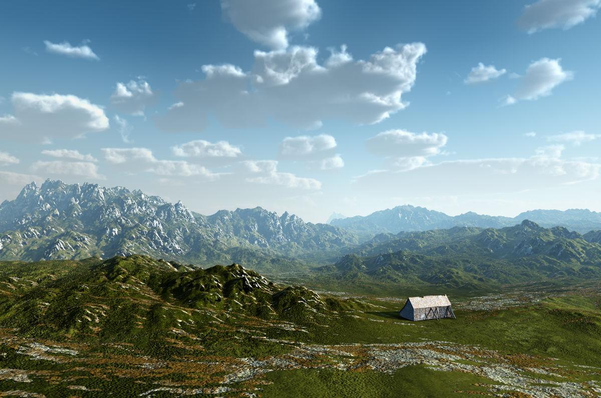Double stacked terrain and the barn from c-ram. The volume clouds were pre-rendered on a sphere and a specular convolved HDRI additionally made of it that gives the sky colours. Rendered premium with soft shadows in half an hour.