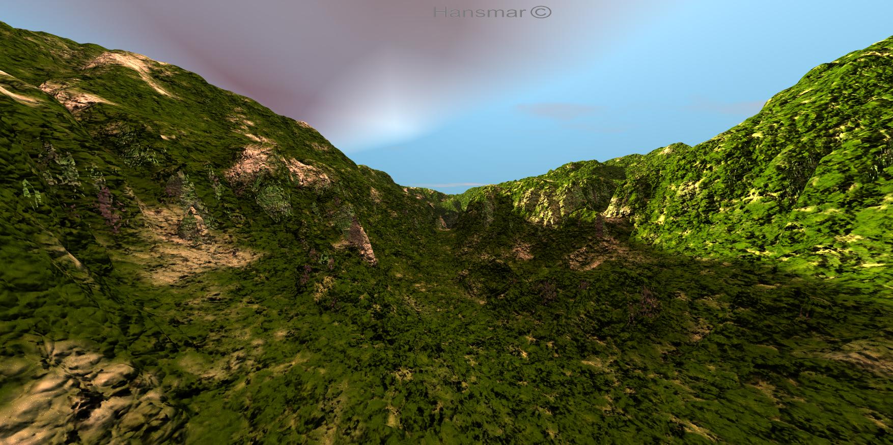 My re-run of the terrain with light is ready. However, I changed the parrallel light into a spotlight and used the natural shadow of the terrain to let is only light the top of the mountain on the right. I also modified the terrain, which helps to get rid of the somewhat flat light.