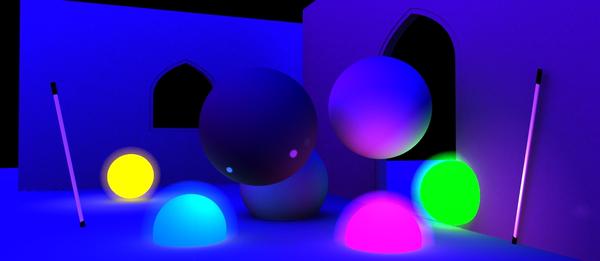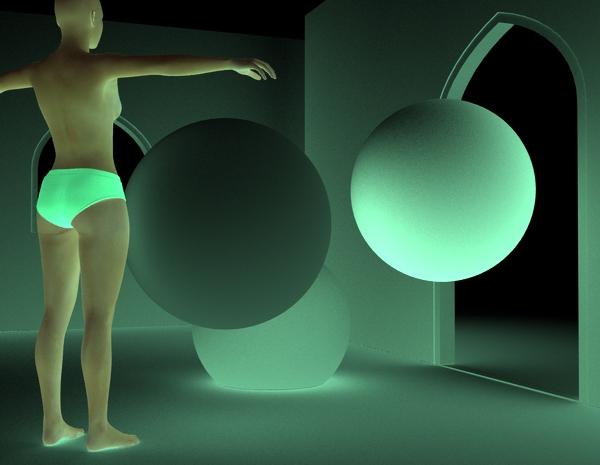 I'm really happy with the "blacklight" test above so I composed this scene (straight out of DAZ w/no retouching). There is a lot going on here to make this work- Multiple Ubervolumes (around spheres and filling scene), 4 point lights, 2 distant lights and a lot of materials/surfaces work with V4 and clothing.