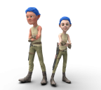 Thanks for the idea of mixing The Girl / The Guy in.  The facial style matches well and the resulting body shapes are a little less stylized but still toony.  Here's a quick render where I was playing with postwork styles.