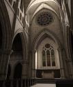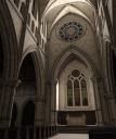 Here's a try using Sacrament by Jack Tomalin. The cathedral has an open back but it's far from the front, so little light reaches the interior. I did this as Scene Only, so all the light is coming from 4 ghost lights: a 1000K light in front of the rose window, a 200K light in front of the rose window but facing the window itself, a 1000K light in front of the lower window, and a 100K light in the left alcove. A 500x600 version took 6 min 17 sec to get to 100%. This render of 1000x1200 took 23 min 58 sec to get ot 100% (4 times the area, 4 times the render time). Click on image for larger version.