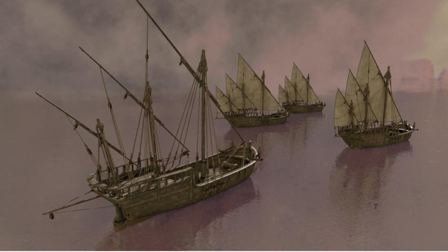 This test (merchant Ships image above) was simply several renders to simulate various exposures of one main light source (the sun) along with the subtle additions of indirect light built in from the surrounding environment. The rendered environment had no water, but the sun cast light across the ground toward, and fairly close to the camera, which ended up casting some cool effect light from the ground in the final HDRI when used in the Background using GI - I didn't even use Indirect.