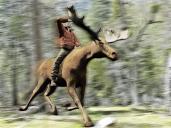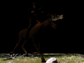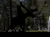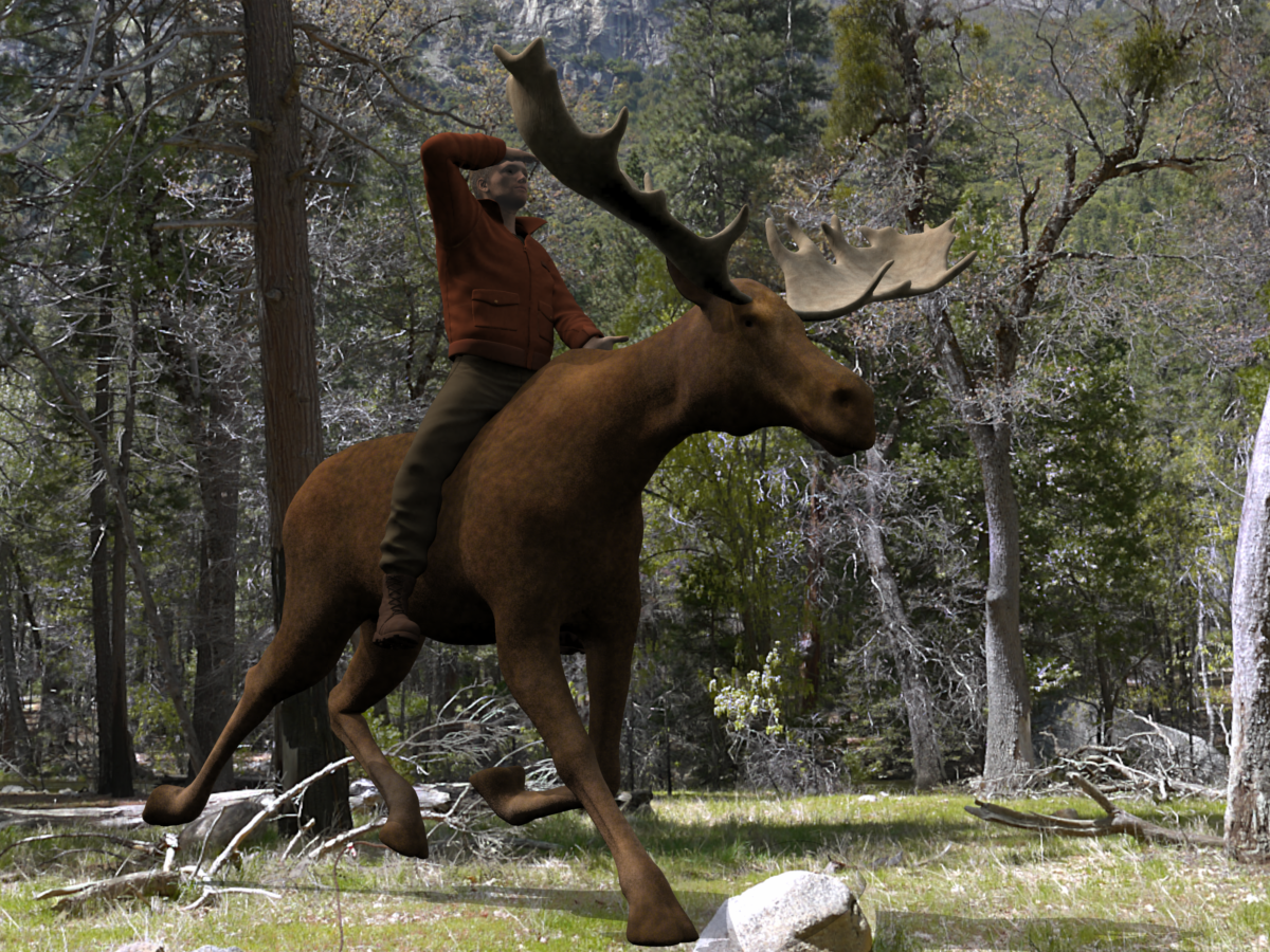Wanted to put the moose from AM to work.  Changed the shaders a little with mixers to make him more visible.  Added a Garen 6 rider because, um, why not?  Have a plane and sphere as shadow catchers for the ground and the rock.  Also inserted a couple lights because the HDRI (Dimension Theory's Yosemite) seemed too dark considering that the moose seemed to be in the clearing to my eye.