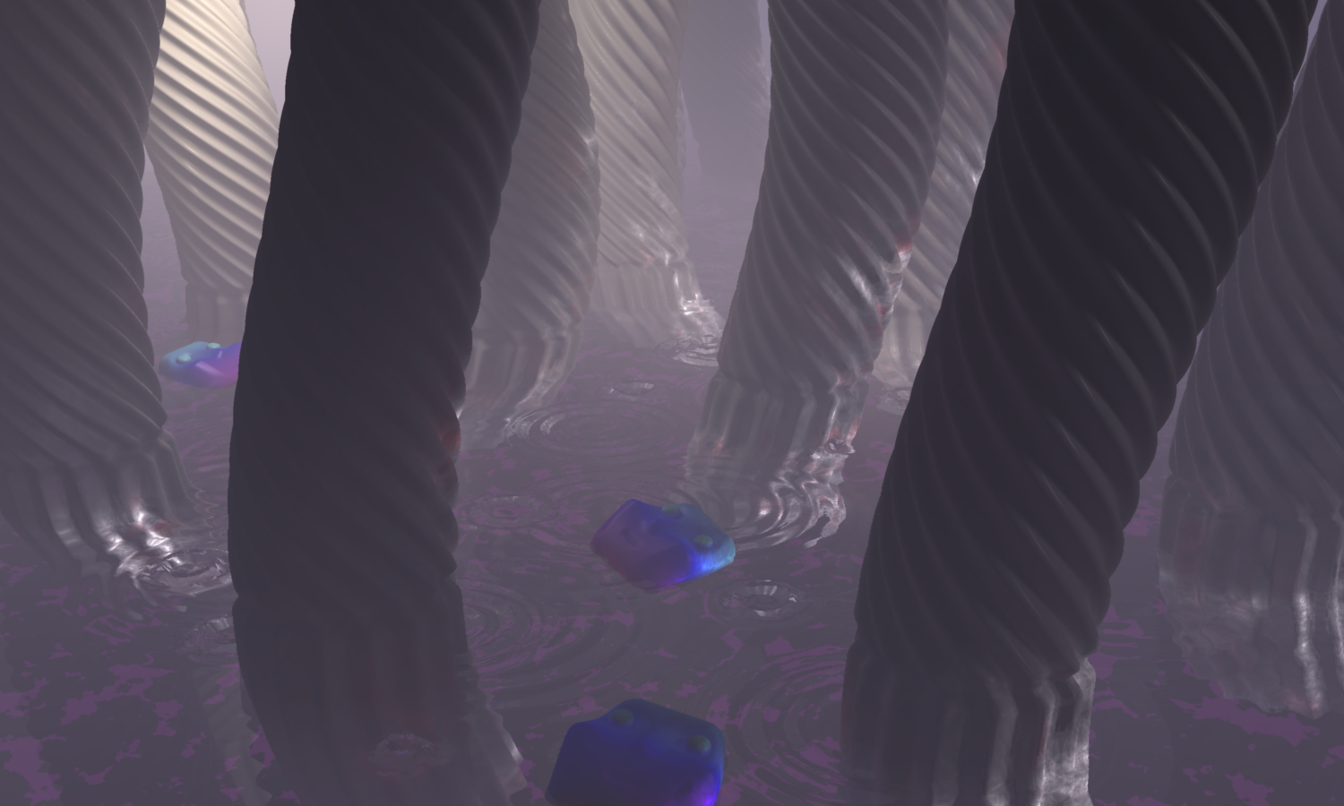 I'm really liking the use of the old sky to get some great foggy atmospheres. The trouble with using Fog is that it interferes with the lights in the scene - but this way I can have thick fog and still use any other light I want. Also there's a more asthetically pleasing colour fade over distance...
