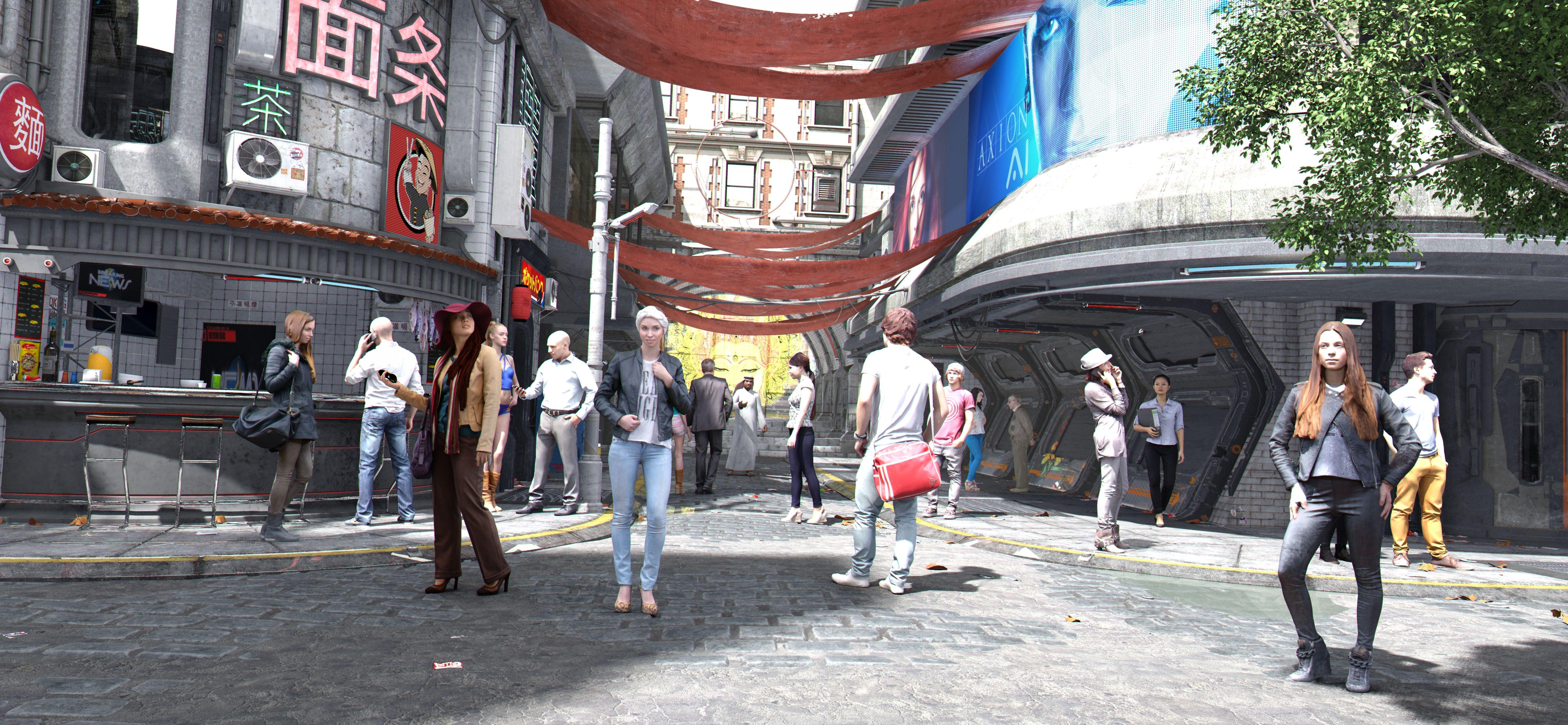 Once again, a great image - have you thought of adding 'translucency to the leaves and sheets spanning the buildings - I know this will add to the render time, but it seems to me that you are looking for greater levels of 'reality?'