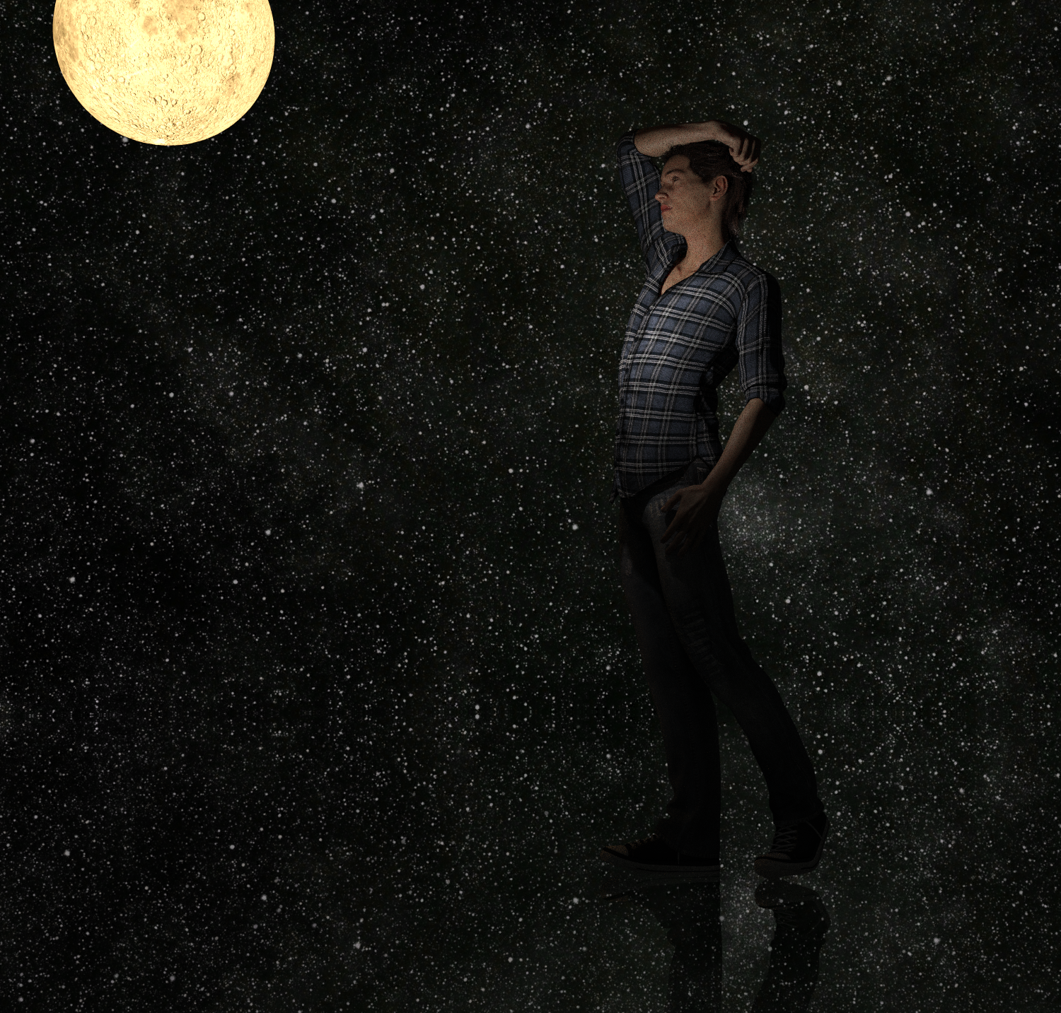 Here is my "Lifted" render, straight out of DAZ, no postwork, no cropping, with the stardome. One of the biggest challenges I had with this piece was finding a good space HDR.I guess I could postwork a background and then flip it for the reflection, but I'm not sure how good it would look. I think the converted stardome is a better solution. DigiVault's stardome comes with 24 different textures, all very beautiful. They appear to be 8192x8192. I'm downloading some hi-res NASA pics which I'll crop to that size and see if I can use them as additional textures. Should be interesting.