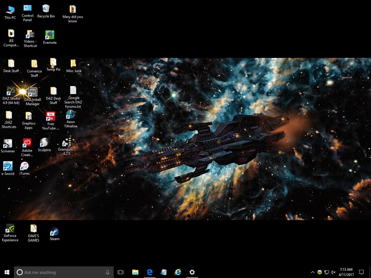 Here's my desktop. The picture changes with every new render. Note I cleaned it up and put a bunch of those miscellaneous files into a folder "Misc Junk." ...Maybe someday I'll get around to clean that up.