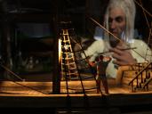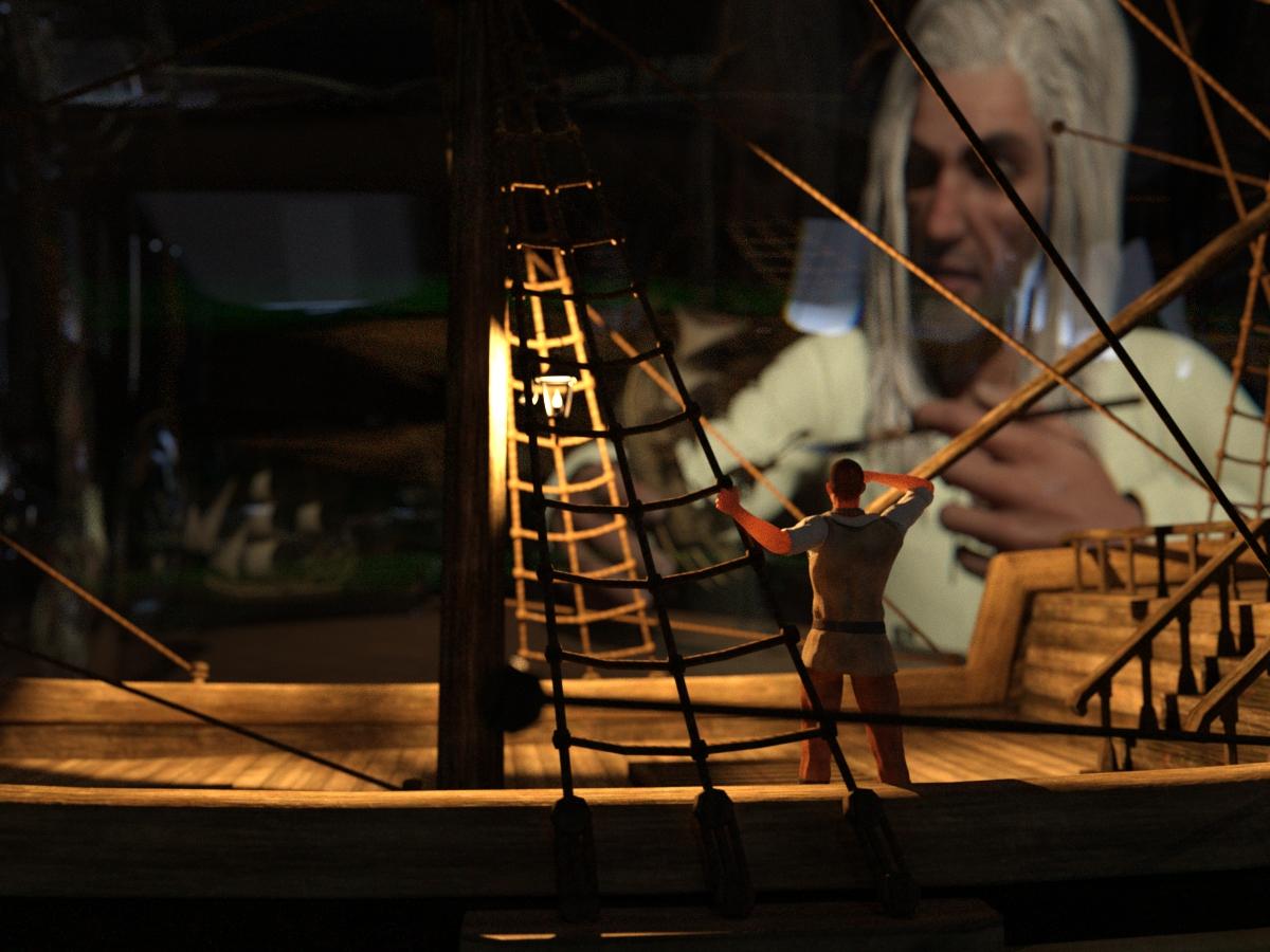 Ok, this is not a step forward in composition, but had to be done. I wasted most of the day creating my own ship for in the bottles - a schooner versus the pirate ships I had been using. I think it takes away from the story, as there's no longer an empty bottle for the ship he's carving, but since I spent all that time on it, I had to render it and share it.