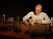 Here is the latest view from inside. Most of my effort has been on the glass shader settings for the bottle to try to get the right reflections/distortion for the background to convey more clearly the situation (in addition to the model in the creator's hands and the other ship in a bottle next to him). We'll keep plugging along...