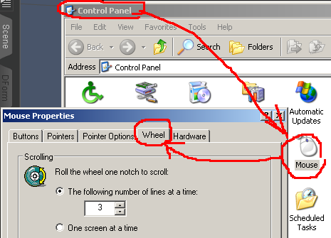 @mac, you can change how many lines the scroll wheel scrolls at one time if you don't like the default, or if somehow the default got changed. In Windows XP, go to Control Panel > Mouse > Wheel tab.
