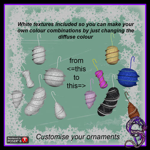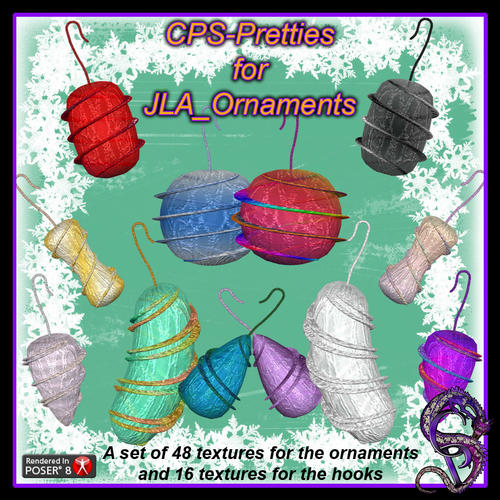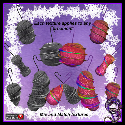 A fully featured texture set that includes bump & specularity maps, for the JLA_Ornaments (RDNA Silent Night - Day 4). 48 textures for the ornaments and 16 textures for the hooks. Also includes a white set so you can create your own color variations by altering the diffuse color in the program of your choice.