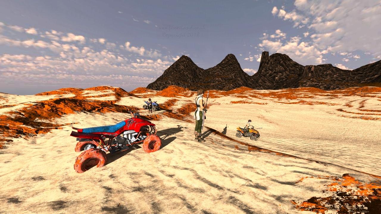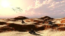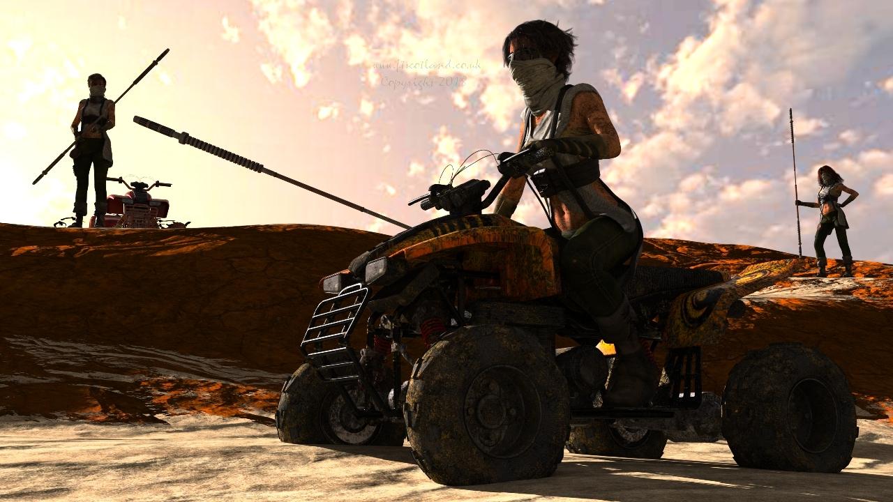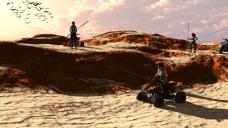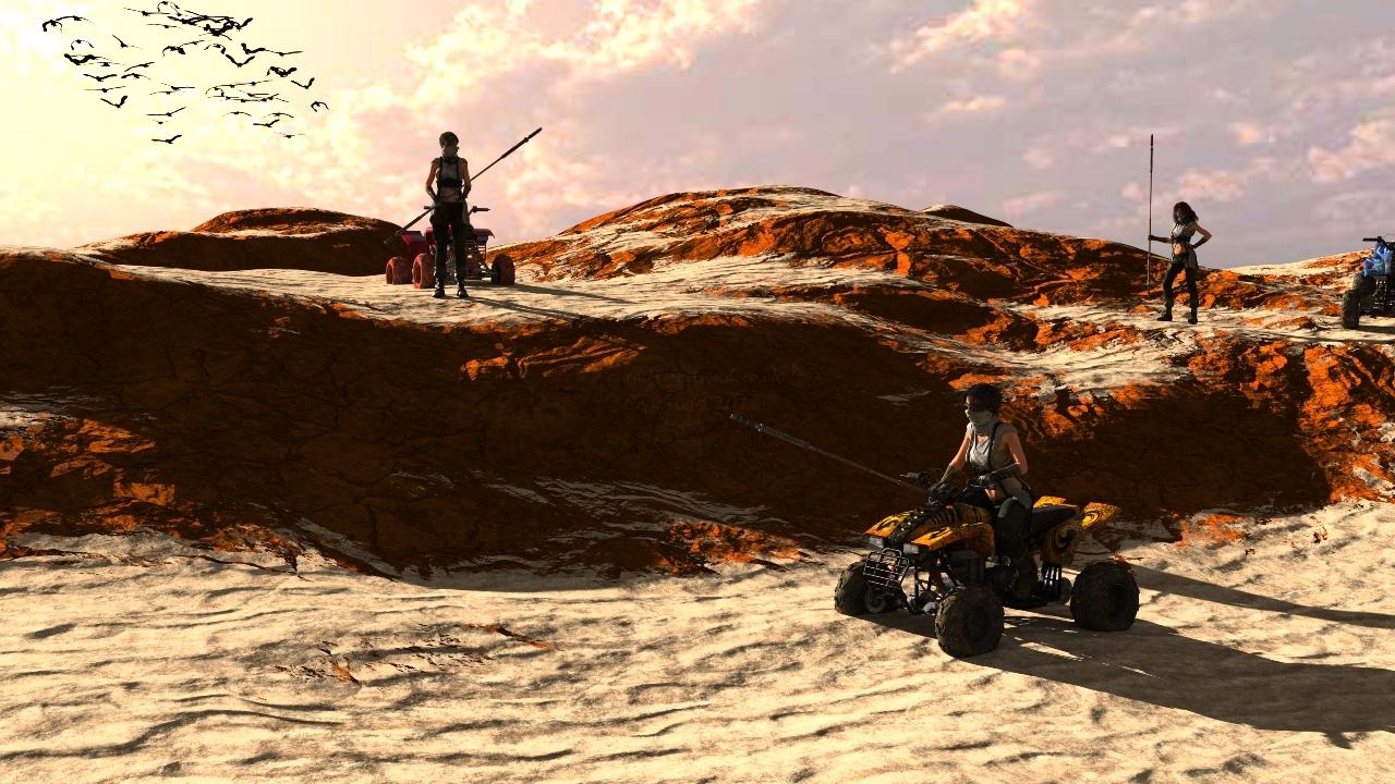 This is Terradome3, Genesis 3, Aftermath Parched, ATV 4x4, Crows from Flock of Gulls, one distant light where the sun is and the .jpg from Merlins Crossing skydome in the Environment Map of the Iray Dome.