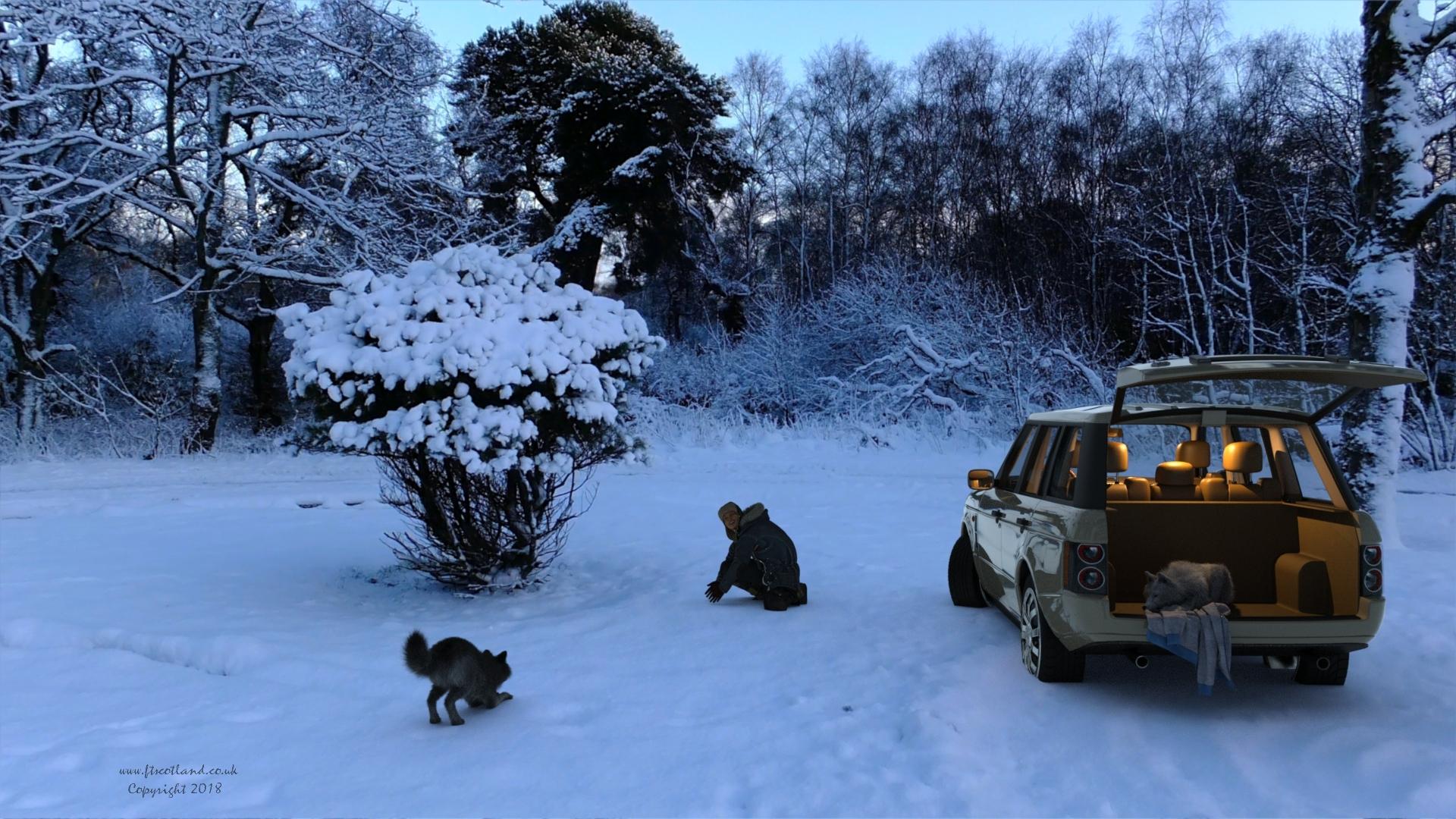 I really love the back of the car being open, and the car light on. That adds so much realism to the scene! And the frisky critter is such a nice touch. Well done Sandy! :)