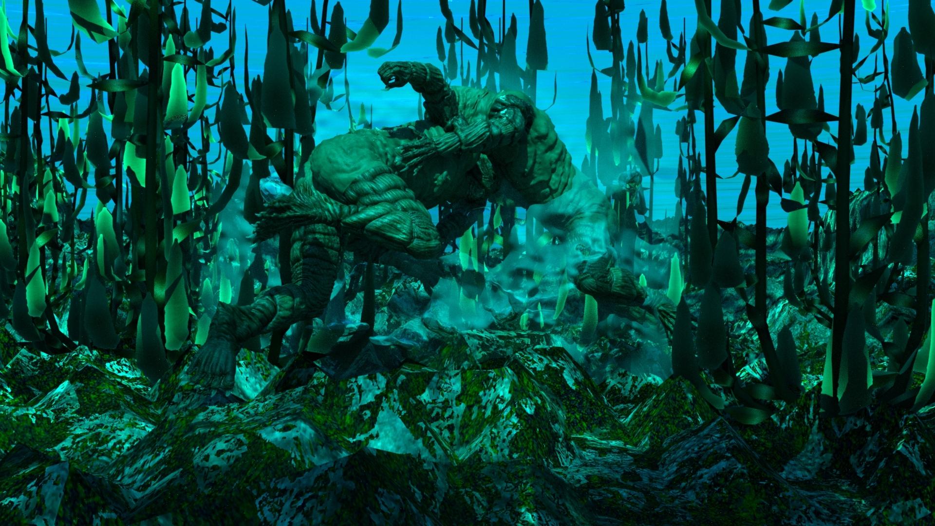 An underwater fight scene I have been working on. There is a Terradome3 scene with a TD3 Water around everything that is set to Volume/Chromatic. It has turned everything green in this one :) The Two Creech are a Brown/Tan colour and the Seaweed is brown so it is the Transmitted and SSS colours that are turning them Green.