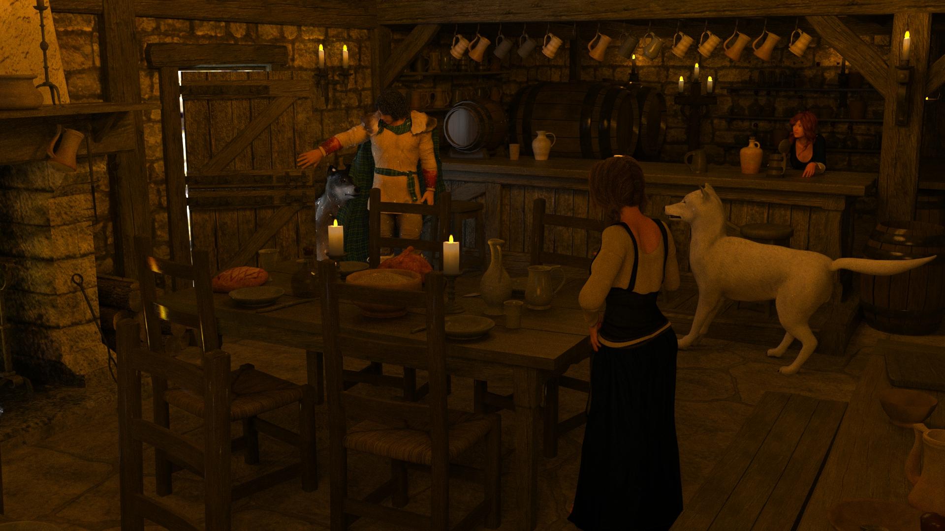 I'm redoing the tavern just now, 24 hours and only 55% done, as I redid the white wolf fur. The scene itself isn't finished yet as I have thought of a few other things to add :)