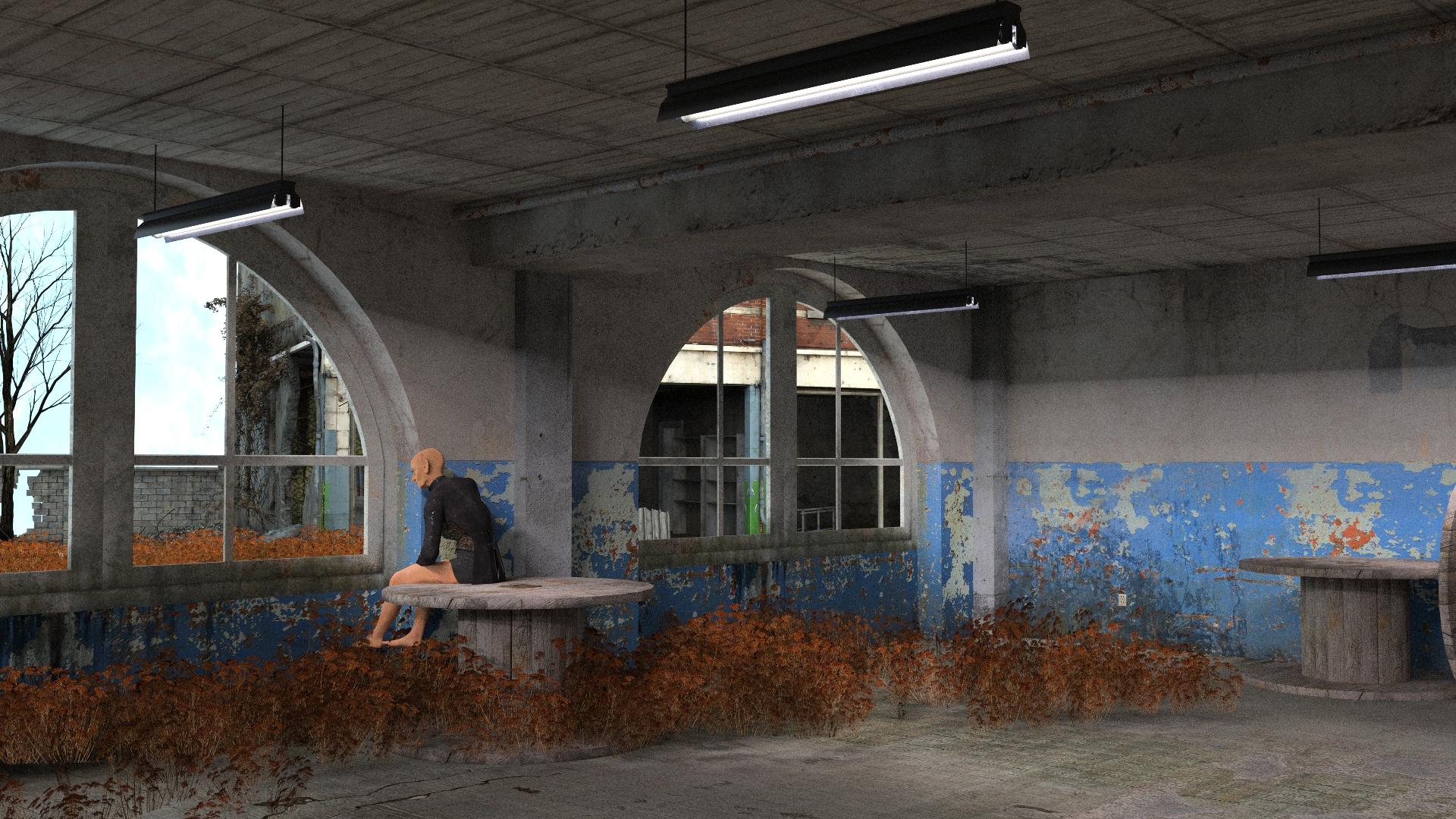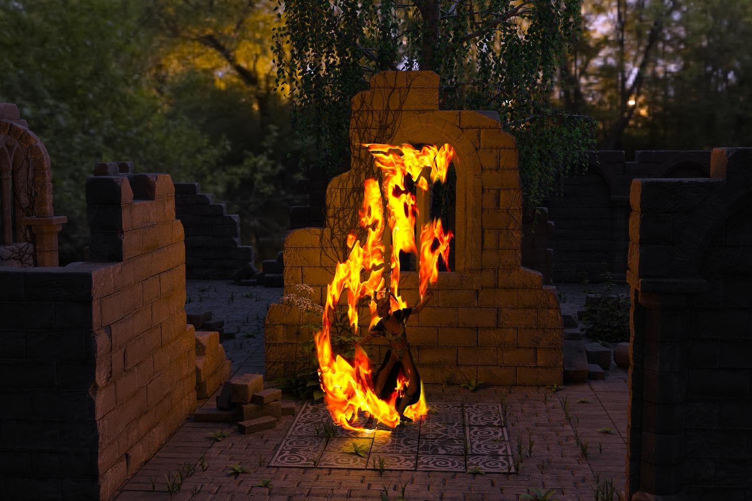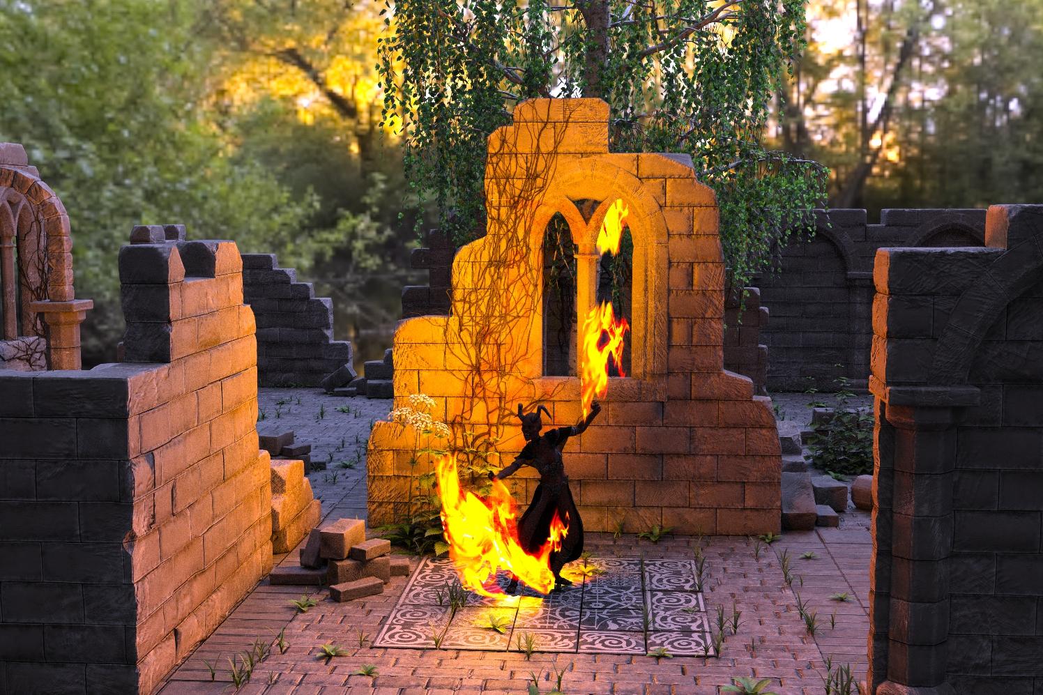 Archaic Ruins by Merlin this time. The dancer is Sachra and the flames are from The Library on a cylinder with some volume. Lighting is from an HDRI and the flames being made emissive.