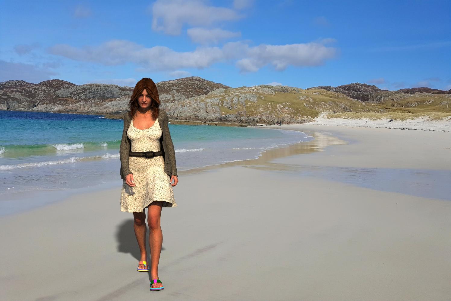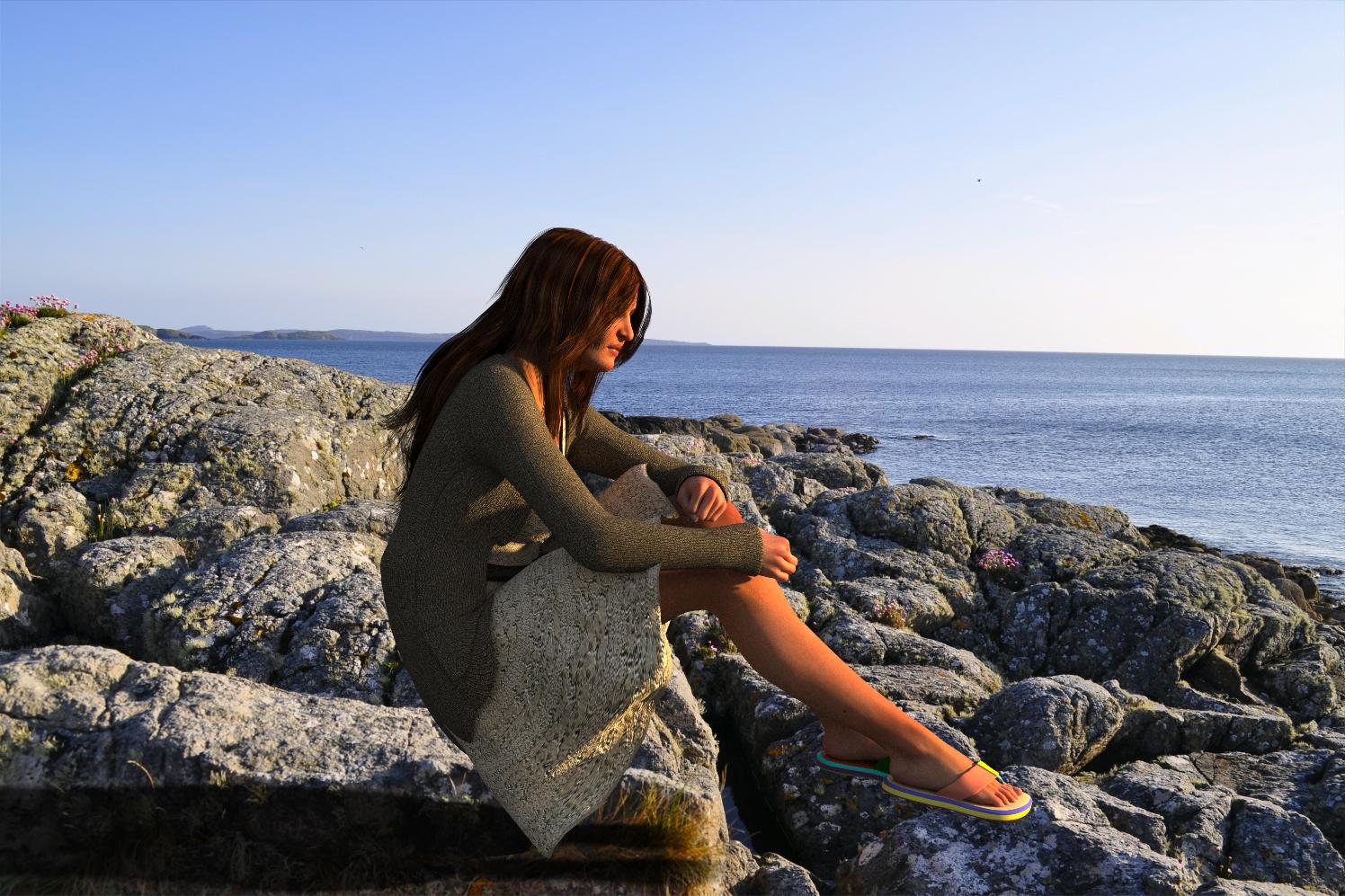 Achmelvich Bay background Genesis 2 Female, FW Joannie HD, Victoria 5 UV Set. Librarian Outfit with G2Female Flipflops and Flirty Hair