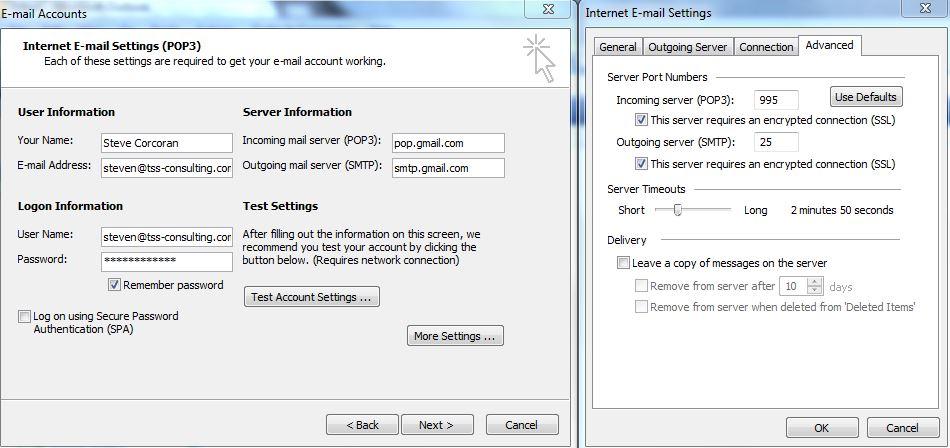 I may have misread your complainnt, but, I process my emails in Outlook and our company email system is Gmail. The attached picture shows my settings (Outlook 2003, but works in 2010, too). The only glitch I've found is that sometimes Gmail will filter out a message as junk and not forward it to your Outlook. If you're missing something load the web-based Gmail and check your junk folder. If you need the messages available to other mail programs as well, tell Outlook to leave a copy on the server.