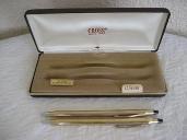 Not sure I mentioned this before, but a few weeks ago I went to a household sale and wandered through just looking at all the silly kitsch crap when my eye spotted a pen & pencil set in its original case and cardboard sleeve.  Upon examination, it turned out to be a 10K gold filled pen & pencil set by Cross which I knew was not cheap.  The price sticker on it for the sale was $10. smiley  I snatched it up and gladly paid my $10 to the ladies running the sale.  When I got home I was disappointed to discover that the pen didn't work, i.e. it wouldn't twist to eject the nib.  But the pencil worked just fine and even had several original leads still in the cartridge and the original unused eraser under the cap.  Out of curiosity I googled what the retail price of that set would be.  I think $220 was the highest price I found, but many discount places had it for $160 to $130, and you could get a used set on ebay for around $50.  Now I'm not enthralled by overpriced bling like solid gold pens for $5000 or gold Rolex watches for the price of a kidney operation, but this is a nice looking pen set and it's not just cheap gold plate (a few atoms thick).  "Gold filled" means that the metal is a sandwich of gold with a base metal like brass in the middle of the gold, and by weight the gold is at least 5% of the weight of the metal in the object which means that it doesn't scratch off or flake off.   So, knowing that I had lucked out and gotten a nice quality item for a song, I looked up the Cross company and discovered that their pens have a lifetime guarantee. yes  I contacted them and sure enough they would fix the pen for "free" provided I paid postage and handling ($10). indecision So I sent it in for repair which took three weeks.  To make a long story short (too late), for a total of $20 I now have a fully functional classy looking pen & pencil set to display on my desk. cool Wheee...