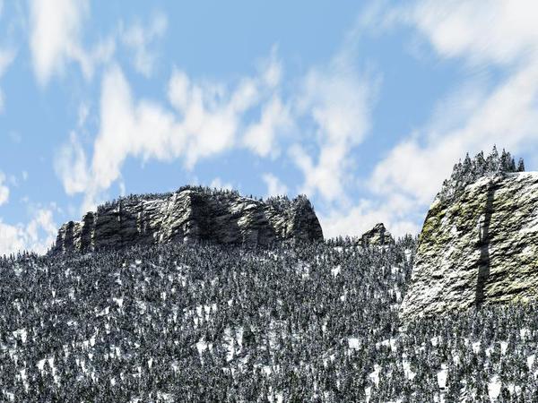 Another attempt with faked spruces. They are made with terrains. I have now tried to give them a bit of a snowy look. I felt that the standard anti aliasing was too strong for the little "trees". The transition between snow and fir needles was getting too blurry. Therefore I reduced the anti aliasing tolerance in the render options to 40. I hope this is not to much now.