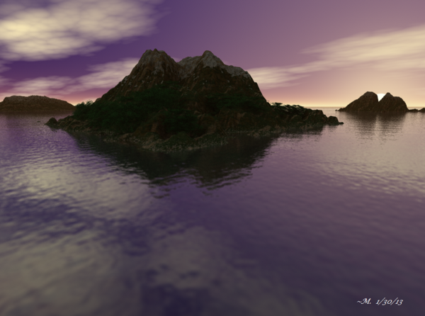 Thanks again for creating and sharing this tutorial, David! I learned a lot and am enjoying putting these tips into practice. Here's my next attempt at a landscape...I used different terrain, sky, and water materials and couldn't resist eroding the terrain a bit, but otherwise tried to stick fairly close to what you did.