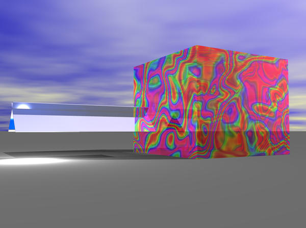 Anyway, during my aforementioned abstract addiction, I decided to try building a kaleidoscope in Bryce. I had a couple when I was a kid, and I remembered how they were made - just a 3-sided triangle shaped 'tube' made of reflective material (usually polished metal). Then they put a hamster-cage sort of thing on the end with rocks, rinestones, or whatever, which are reflected in the inside surfaces of the 'tube'. Sounded like an easy job for Bryce.