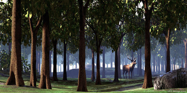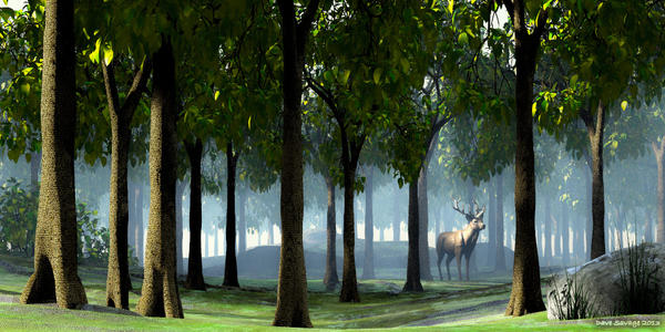 The Deer/Stag certainly is a good addition and takes away the monotonous look that tree scenes sometimes can give. I would suggest you make him smaller, though, as proportion/perspective-wise, he looks way too big.