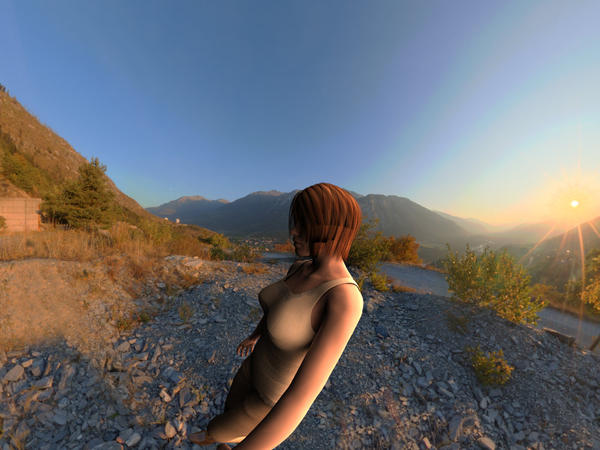 Meanwhile there's yet a lot to discover in Bryce. It can be more than we think. Here's a simple render with Viki 3 and an HDRI. She's looking away from the sun and her face is not lit. The scene has a horizontal FoV of 190° and a vertical one of 120° by using the EWL.
