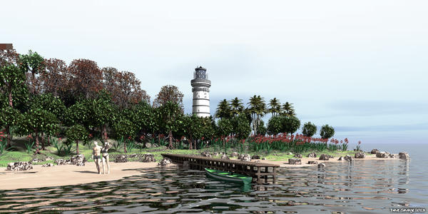 In other news, the alternative render I was doing of the Island got to about 4 hours in before I decided it wasn't looking right so I cancelled it and mucked about with it some more. Taking Horo's comment on board, I added people. Sorry it's not just girls sunbathing, but I already had this couple ready to go.