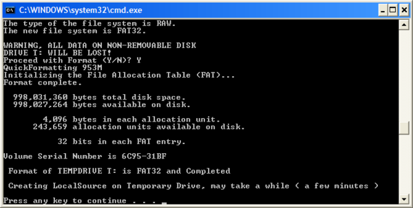 At first when it askes "WARNING ALL DATA ON NON-REMOVABLE DISK DRIVE T: WILL BE LOST! Procede with format Y/N?" - I was thinking hmmm any key would be interesting to press there HAHA
