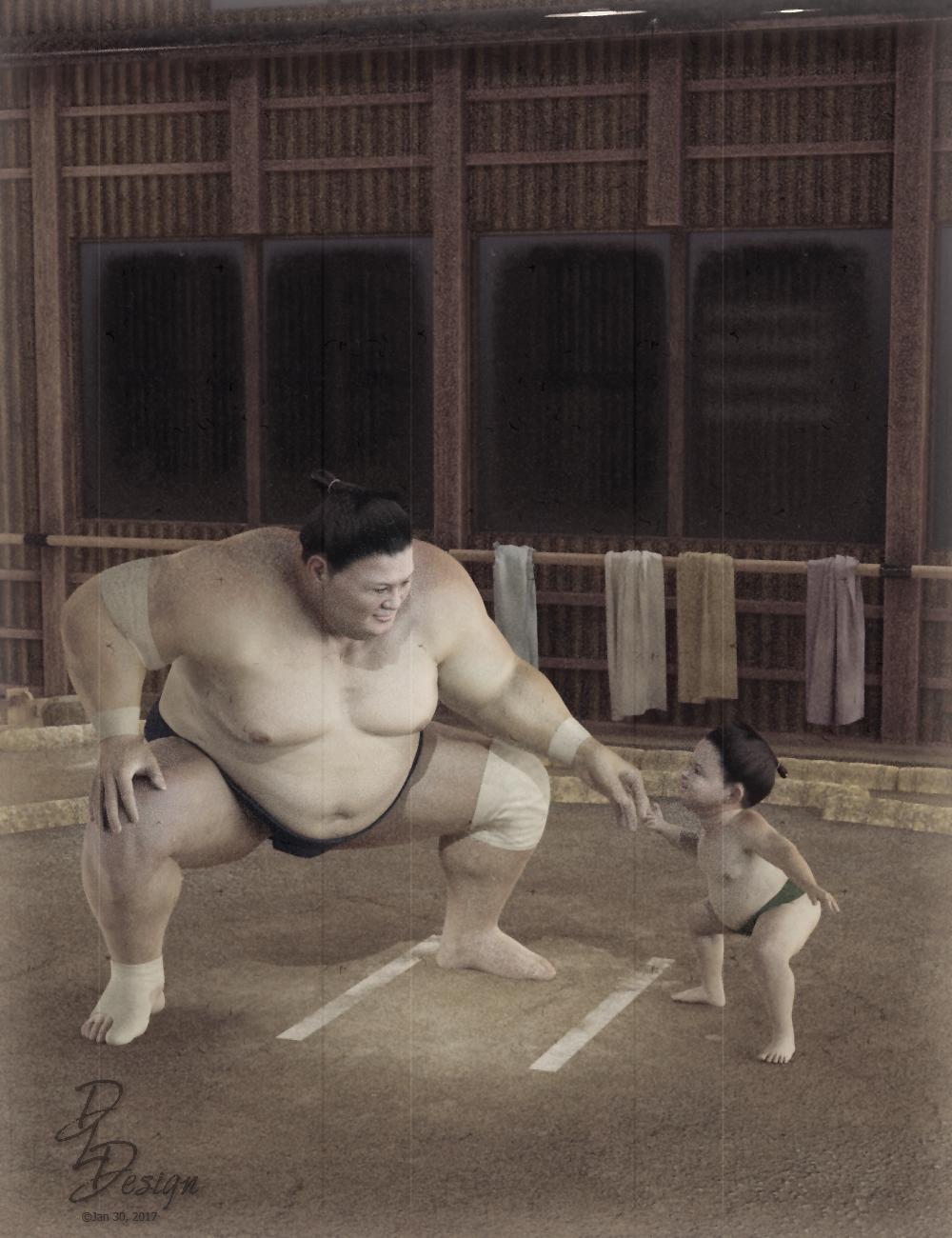 This image is using 2 sumo figures.  The child was a lot of tweaking by reducing George and adding Growing Up and Little Ones.  Used a spot light to highlight the figures and Ghost Lights to help give it some ambient.  I have to say, the Sumo character has such a beautifully detailed face.  I love the expression I was able to get.  It was just perfect for what I wanted.  Thank you Deepsea for such a wonderful character and all the work you put into all the pieces.  My render fell back from the card to CPU, but it was worth it.  LOL